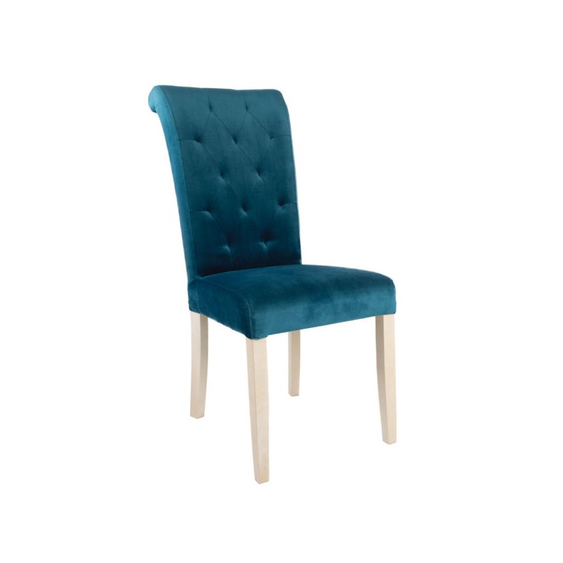 Eleganckie, stylizowane krzesło VILLE wykonane z drewna bukowego lub dębowego barwionego na jeden z wielu kolorów dostępnych w palecie wybarwień. Krzesło jest w pełni tapicerowane, a pikowane guzikami oparcie dodaje mu szyku i elegancji. Bogata kolekcja tkanin oiciowych (m.in. brudo-, plamoodporne) oraz szeroka kolorystyka wybarwień drewna umożliwiają zaprojektowanie krzesła w niepowtarzalnym wykończeniu.
