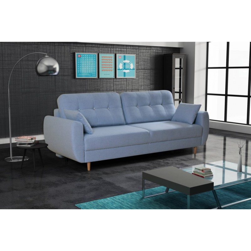 Nowoczesna sofa rozkładana VRD-4350 nawiązująca do stylu skandynawskiego, z pojemnikiem na pościel. Wysokie nóżki nadają jej lekki i elegancki wygląd oraz umożliwiają bezproblemowe utrzymanie czystości pod meblem bez konieczności jego przesuwania. Komfortowy sen i wypoczynek gwarantują zastosowane sprężyny bonellowe oraz wysokiej jakości pianki tapicrskie, a pojemnik na pościel zapewnia dodatkowe miejsce do przechowywania. Nowoczesny mechanizm umożliwia rozłożenie mebla do pozycji spania poprzez lekkie uniesienie siedziska do góry i przesunięcie do przodu. W porównaniu do tradycyjnych rozwiązań tego typu, konstrukcja ta eliminuje niebezpieczeństwo zarysowania podłogi.