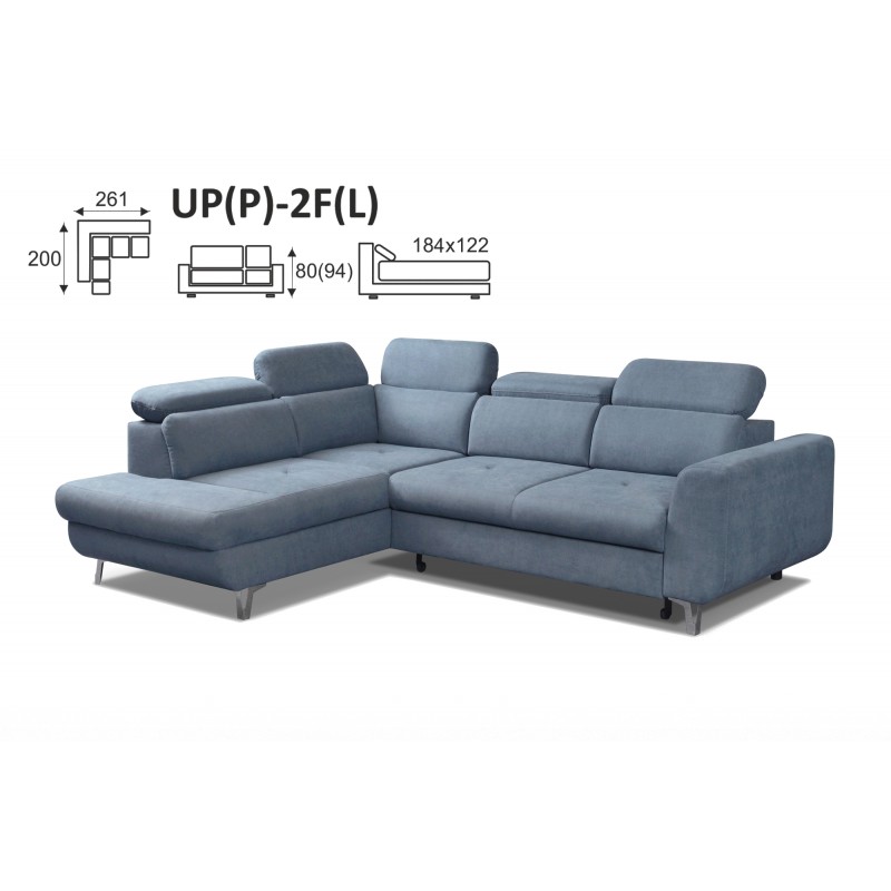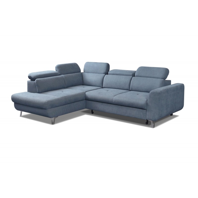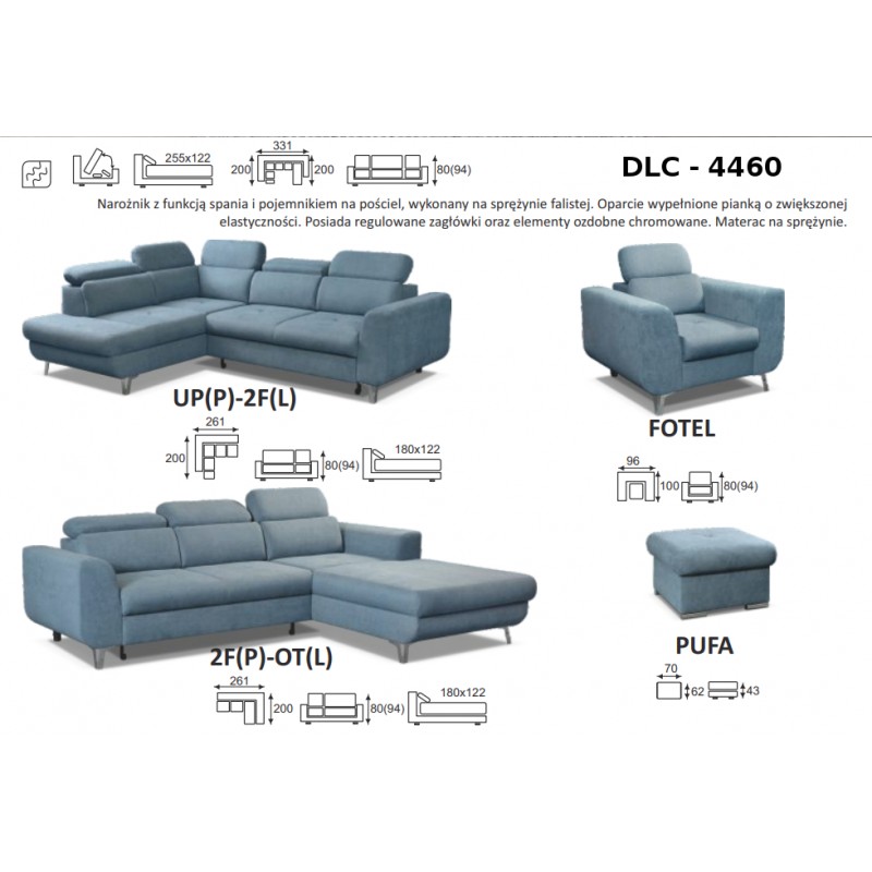 Nowoczesny i komfortowy narożnik DLC-4460 z funkcją spania i pojemnikiem na pościel o wymiarach 261x200 cm. W narożniku zastosowano sprężyny faliste, a dla zwiększenia komfortu wypoczynku oparcie wypełniono pianką o zwiększonej elastyczności, zamontowano też ruchome zagłówki. Narożnik posiada smukłe chromowane nóżki, które dodają wizualnej lekkości oraz ułatwiają bezproblemowe utrzymanie czystości pod meblem bez konieczności jego przesuwania. Dzięki szerokiej ofercie tkanin (ponad 800 tapicerek do wyboru, m.in. brudo-, plamoodporne, hydrofobowe, ekoskóry) możemy dopasować narożnik do swojego wnętrza oraz nadać mu indywidualny charakter.