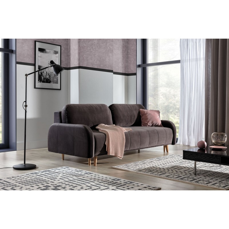 Nowoczesna sofa rozkładana Marti w stylu skandynawskim, z pojemnikiem na pościel, z dużym spaniem po rozłożeniu, z gustownymi przeszyciami na siedzisku i podłokietnikach. Kanapa posiada system rozkładania typu DLK (kładziemy oparcie), dzięki czemu uzyskujemy dużą powierzchnię spania o wymiarach 145x200 cm oraz funkcjonalny pojemnik na pościel. Sofa wsparta jest na smukłych, drewnianych nóżkach, wykończona może być tkaniną brudo-, plamoodporną, czy efektowną plecionką, w wielu kolorach do wyboru. Dla większego komfortu, w poduchach siedziskowych, zastosowano piankę wysokoelastyczną oraz sprężyny faliste. Kanapa rozkładana Marti to idealne rozwiązanie dla osób poszukujących wygodnej i funkcjonalnej sofy.