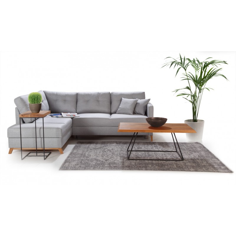 Nowoczesny narożnik rozkładany STOKE o prostej formie nawiązującej do stylu skandynawskiego. Wysokie nóżki wykonane z litego dębu dodają lekkości narożnikowi oraz ułatwiają bezproblemowe utrzymanie czystości pod meblem bez konieczności jego przesuwania. W narożniku Stoke zastosowano najwyższej jakości materiały. Wysoki komfort wypoczynku zapewniają zastosowane w siedzisku najwyższej jakości pianki HR, które idealnie dopasowują się do kształtu ciała, dla których bazą są sprężyny typu TopLine oraz miękkie i wygodne oparcia. Pikowany bok oraz ozdobne guziki w poduszkach podkreślają piękno mebla.