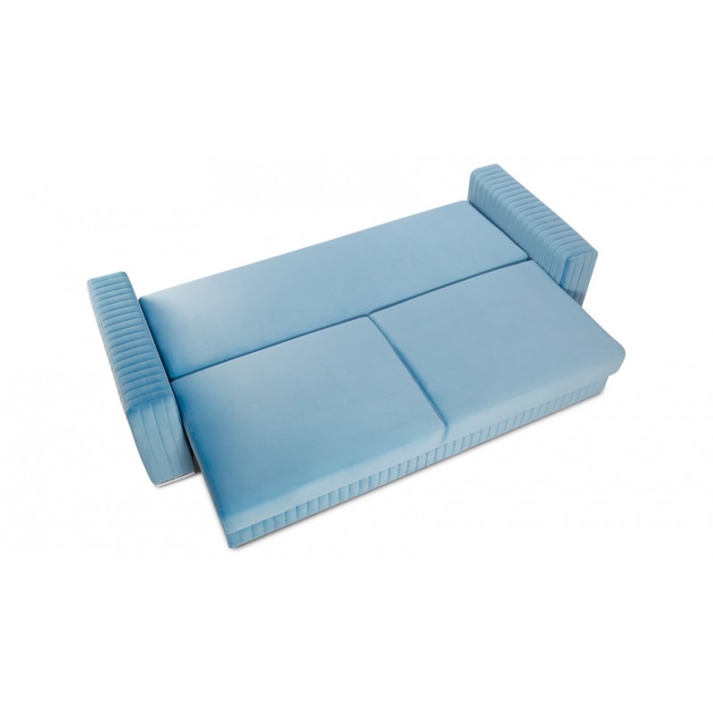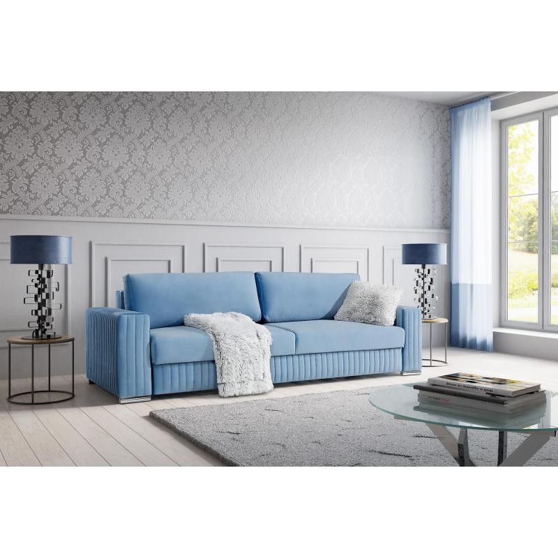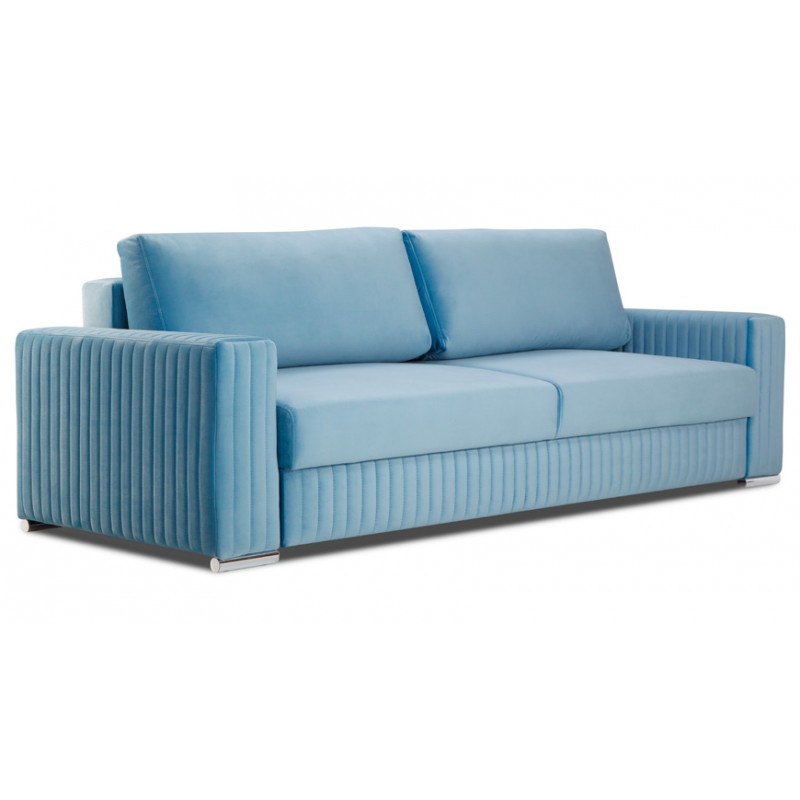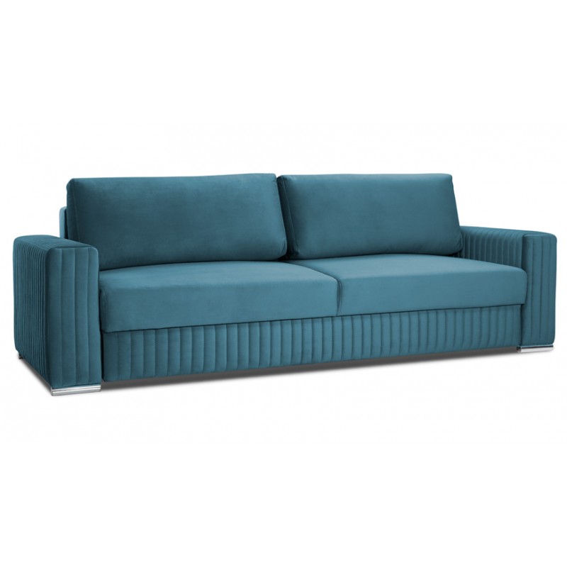 Wygodna i elegancka sofa rozkładana PORTO z pojemnikiem na pościel, szerokim spaniem 150x205 cm, charakteryzująca się prostym kształtem urozmaiconym dekoracyjnymi przeszyciami. Komfortowy sen i wypoczynek gwarantują zastosowane sprężyny TopLine oraz wysokoelastyczna pianka HR, a pojemnik na pościel zapewnia dodatkowe miejsce do przechowywania. Miękkość oparcia zawdzięczamy zastosowanemu wypełnieniu z silikonu oraz wysokoelastycznej piance HR. Nowoczesny mechanizm umożliwia rozłożenie mebla do pozycji spania poprzez lekkie uniesienie siedziska do góry i przesunięcie do przodu, tym samym eliminując niebezpieczeństwo zarysowania podłogi. Sofa z funkcją spania PORTO dzięki swojej prostej formie doskonale sprawdzi się w każdym pomieszczeniu.
