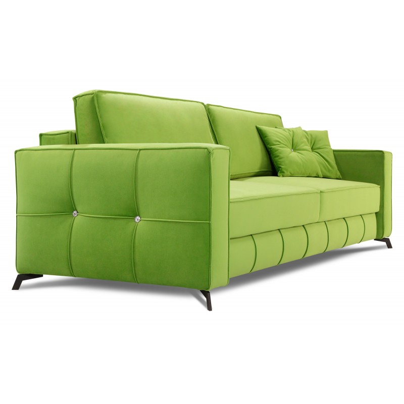 Elegancka I bardzo wygodna sofa rozkładana CRYSTAL, z pojemnikiem na pościel, szerokim spaniem 150x205 cm, charakteryzująca się nowoczesną stylistyką oraz lekką, prostą formą urozmaiconą dekoracyjnymi przeszyciami i zdobieniami z kryształków. Komfortowy sen i wypoczynek gwarantują zastosowane sprężyny TopLine oraz wysokoelastyczna pianka HR, a pojemnik na pościel zapewnia dodatkowe miejsce do przechowywania. Miękkość oparcia zawdzięczamy zastosowanemu wypełnieniu z silikonu oraz piance wysokoelastycznej HR. Nowoczesny mechanizm umożliwia rozłożenie mebla do pozycji spania poprzez lekkie uniesienie siedziska do góry i przesunięcie do przodu, tym samym eliminując niebezpieczeństwo zarysowania podłogi. Wysokie metalowe nogi w czarnym, matowym kolorze nadają sofie lekkości I finezji oraz umożliwiają bezproblemowe utrzymanie czystości pod meblem bez konieczności jego przesuwania.