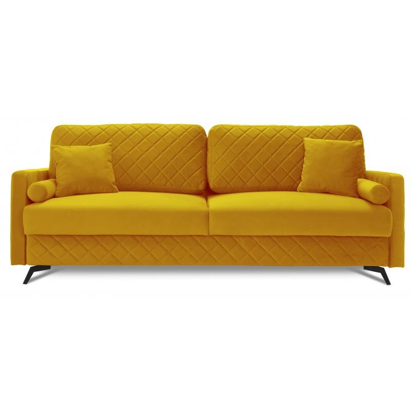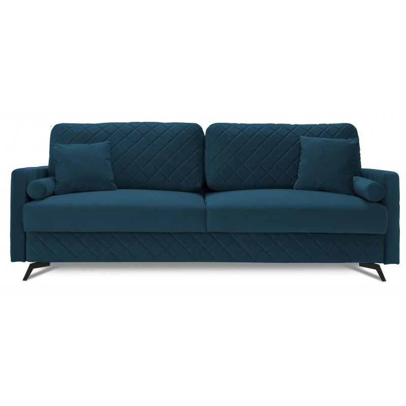 Piękna I bardzo wygodna sofa rozkładana BONITO 3-osobowa, z pojemnikiem na pościel, szerokim spaniem 150x200 cm, charakteryzująca się nowoczesną stylistyką oraz lekką, prostą formą urozmaiconą eleganckimi przeszyciami w kształcie rombów. Komfortowy sen i wypoczynek gwarantują zastosowane sprężyny oraz wysokoelastyczna pianka HR, a pojemnik na pościel zapewnia dodatkowe miejsce do przechowywania. Miękkość oparcia zawdzięczamy zastosowanemu wypełnieniu z silikonu oraz piance wysokoelastycznej HR. Nowoczesny mechanizm umożliwia rozłożenie mebla do pozycji spania poprzez lekkie uniesienie siedziska do góry i przesunięcie do przodu, tym samym eliminując niebezpieczeństwo zarysowania podłogi. Wysokie metalowe nogi w czarnym kolorze nadają sofie lekkości I finezji oraz umożliwiają bezproblemowe utrzymanie czystości pod meblem bez konieczności jego przesuwania.