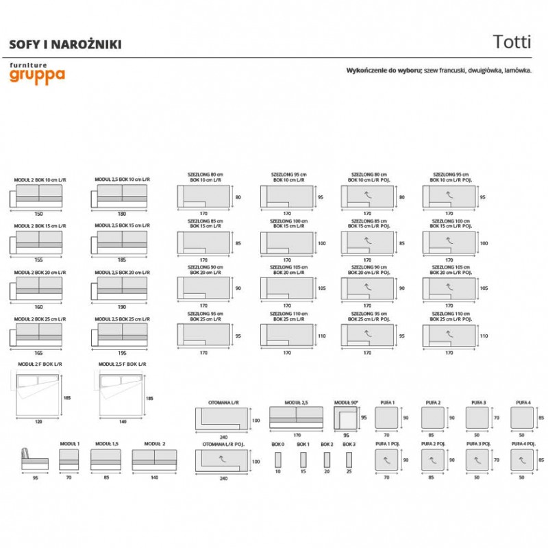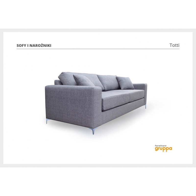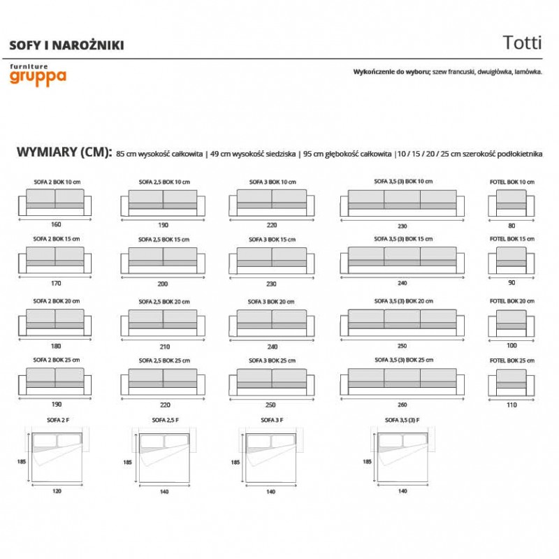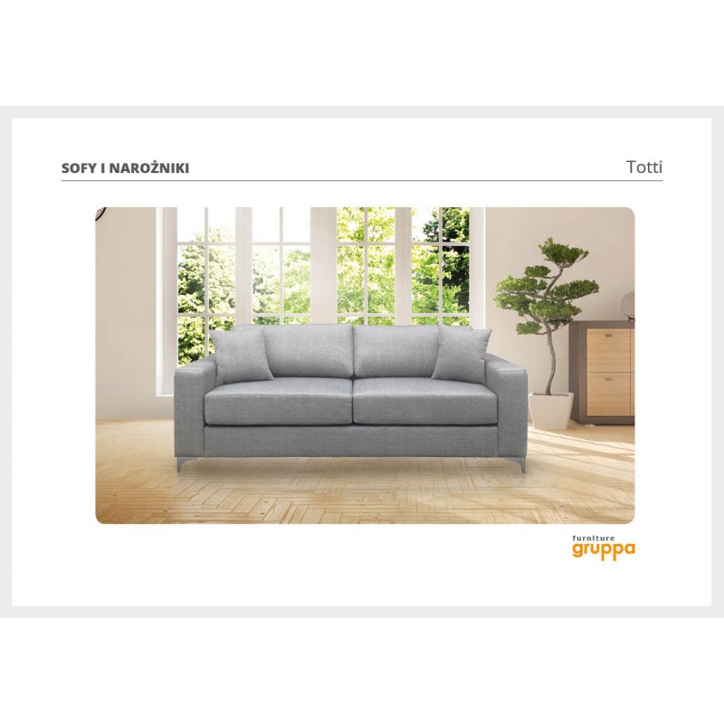 Zgrabna, nieduża sofa rozkładana Totti, o prostej formie, wsparta na metalowych nóżkach, wykończona może być tkaniną wełnianą, plamoodporną lub efektowną plecionką. Całości indywidualny charakter nadają tapicerskie szwy: dwuigłowy, lamówka czy też szew francuski - do wyboru. Dla większej wygody w poduchach siedziskowych zastosowano sprężyny bonelowe lub granulat (możliwość wyboru) i wysokoelastyczną piankę HR. Model Totti dostępny jest w wersji z funkcją spania i nierozkładanej, w różnych wymiarach, w 4 dowolnych szerokościach podłokietnika.
