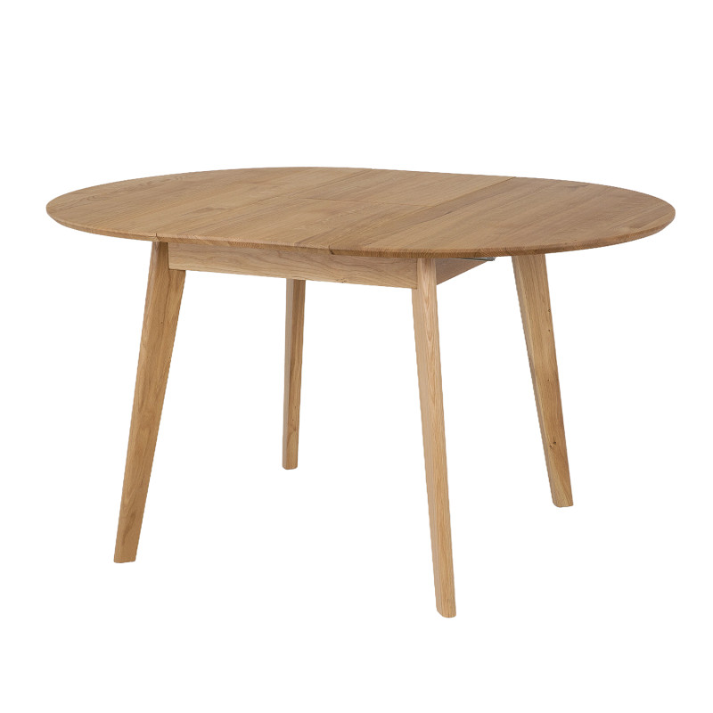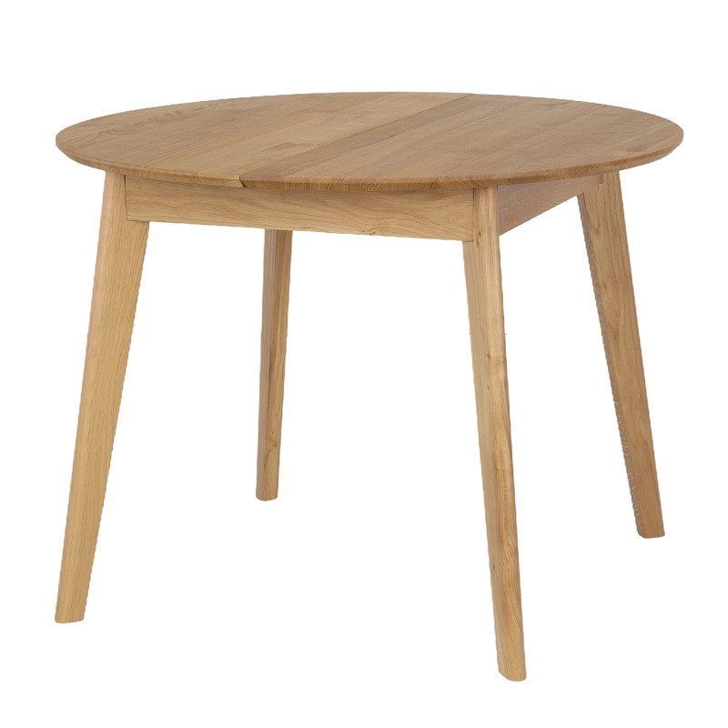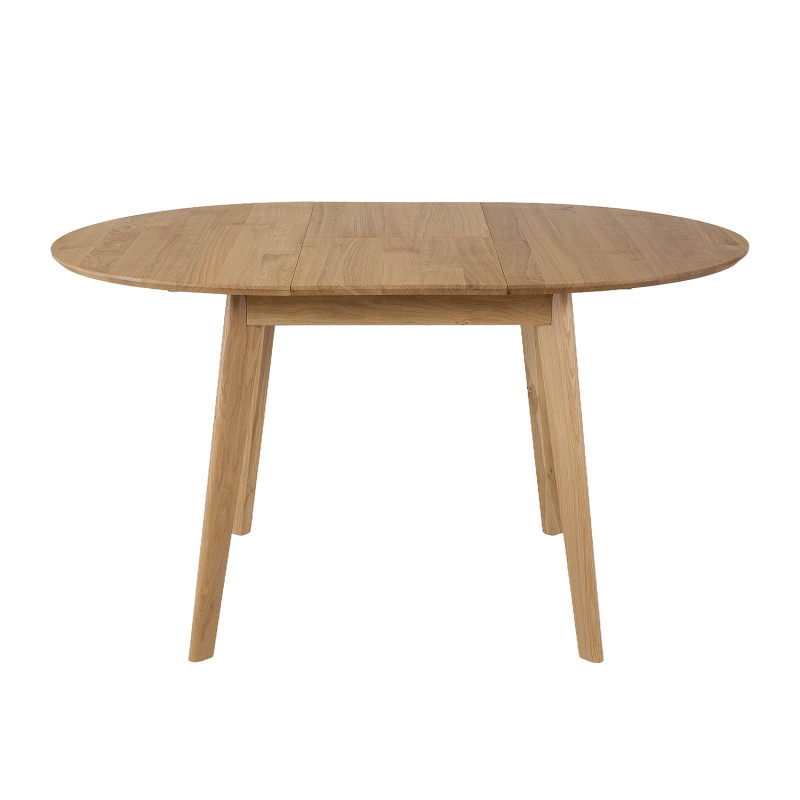 Stół Kaldo to elegancki, okrągły stół z litego drewna dębowego, który łączy solidność z nowoczesnym designem. Ma średnicę 100 cm i możliwość rozłożenia do 137 cm dzięki chowanej pod blatem wkładce. Blat jest zaoblony i delikatnie ścięty, co nadaje mu lekkości. Idealny do wnętrz klasycznych i nowoczesnych. Dostępny w różnych wybarwieniach dębu.
