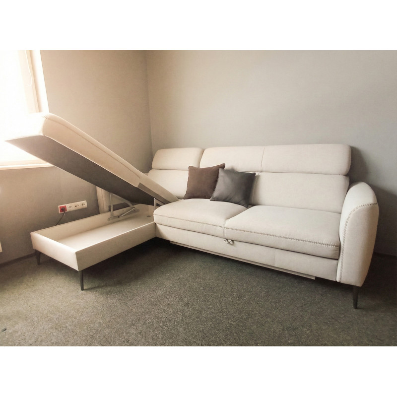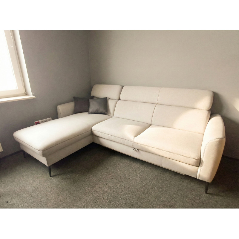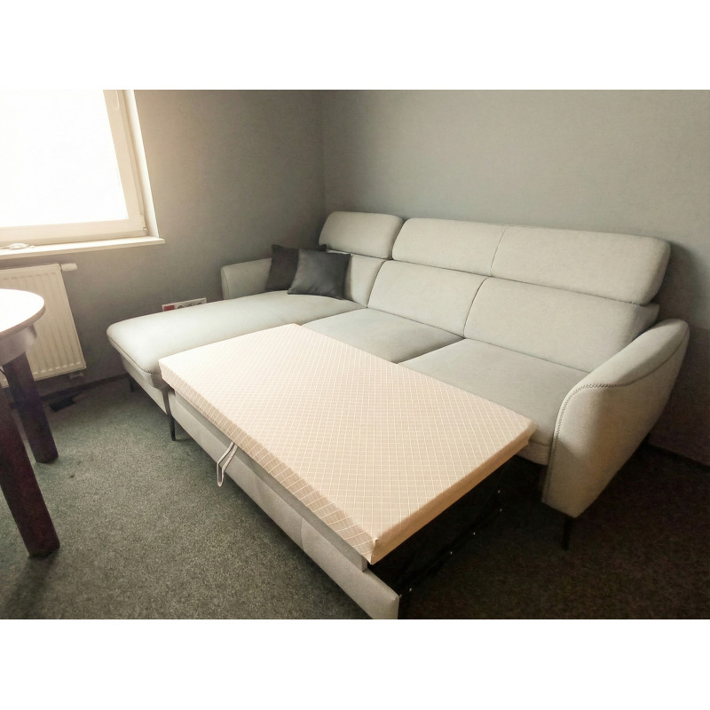 Nowoczesny i wygodny narożnik rozkładany na wysokich nożkach, z funkcją spania i pojemnikiem na pościel. Narożnik charakteryzuje się trwałością, a powierzchnia idealną miękkością. Swoją niezrównaną wygodę zawdzięcza regulowanym zagłówkom oraz siedziskom wykonanym na bazie poliuretanowej wysokoelastycznej pianki HR (High Resiliense Foam), która daje poczucie idealnej miękkości i elastyczności, zapewniając jednocześnie dłuższą żywotność (sprężystość) siedziska. Narożnik jest zaprojektowany z myślą o długotrwałym użytkowaniu, dlatego też użyte materiały są najwyższej jakości. Model ten jest wsparty na wysokich, smukłych, metalowych nóżkach, które nie tylko dodają mu charakteru, ale również umożliwiają bezproblemowe utrzymanie czystości.