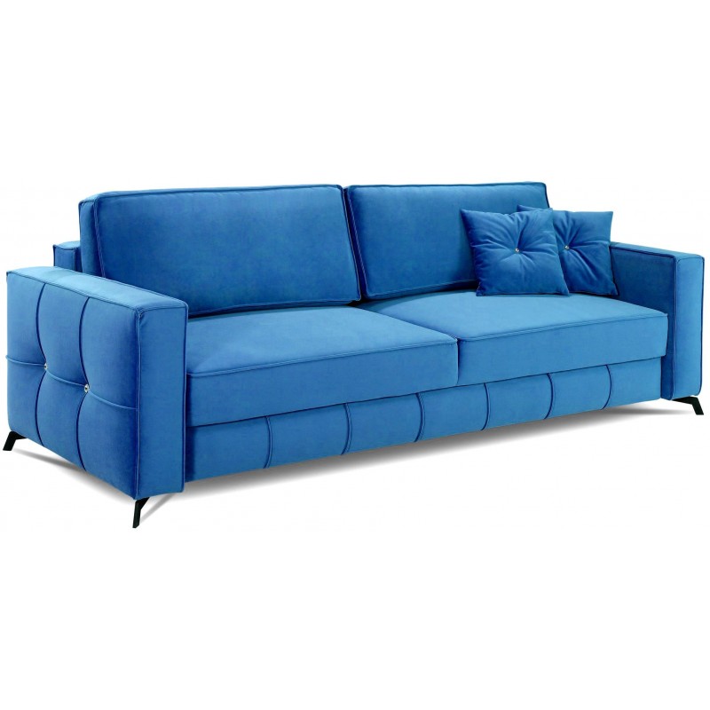 Elegancka I bardzo wygodna sofa rozkładana CRYSTAL 3-osobowa, z pojemnikiem na pościel, szerokim spaniem 150x205 cm, charakteryzująca się nowoczesną stylistyką oraz lekką, prostą formą urozmaiconą dekoracyjnymi przeszyciami i zdobieniami z kryształków. Komfortowy sen i wypoczynek gwarantują zastosowane sprężyny TopLine oraz wysokoelastyczna pianka HR, a pojemnik na pościel zapewnia dodatkowe miejsce do przechowywania. Miękkość oparcia zawdzięczamy zastosowanemu wypełnieniu z silikonu oraz piance wysokoelastycznej HR. Nowoczesny mechanizm umożliwia rozłożenie mebla do pozycji spania poprzez lekkie uniesienie siedziska do góry i przesunięcie do przodu, tym samym eliminując niebezpieczeństwo zarysowania podłogi. Wysokie metalowe nogi w czarnym, matowym kolorze nadają sofie lekkości I finezji oraz umożliwiają bezproblemowe utrzymanie czystości pod meblem bez konieczności jego przesuwania.